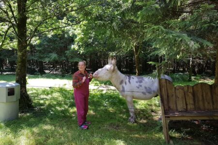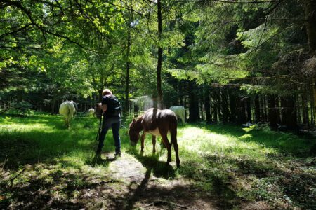 We offer immersive experiences in our woodlands with donkeys for wellbeing, social prescribing programmes and individual one-to-one sessions for people who could benefit from EAL . We also offer donkey treks in the surrounding woodlands. Dyfi Donkey Wood is available to rent by the hour or day to facilitate events, forest groups, woodland activities, and safe dog walking. We have a canopied area to allow for activities, whatever the weather. We also deliver well-rotted manure to local growers/gardeners.